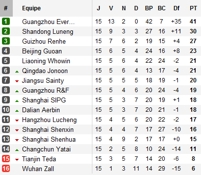 Derrière, le nul entre le second et le troisième ne profite à personne. Car, fait étonnant de cette 15e journée, aucun des huit premiers (mise à part Guangzhou), n’est parvenu à prendre plus d’un point. Il faut donc aller dans la deuxième moitié de tableau pour trouver des victoires : Dalian Aerbin réalise le match de la semaine en s’imposant 4-3 à Hangzhou (quadruplé de Peter Utaka), Shanghai SPIG s’impose dans les derniers instants face à Jiangsu alors que Tianjin et Changchun semblent enfin avoir décollé.