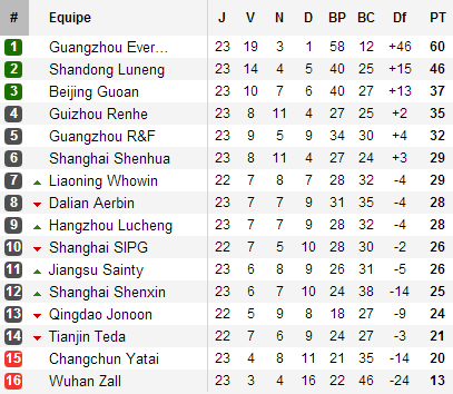 Sauf que chez eux, les coéquipiers de Vágner Love se montrent tout aussi impuissants face à Shanghai Shenxin. Un coup pour rien donc ? Pas vraiment. Car malgré sa déconvenue, Guangzhou Evergrande est désormais assuré de disputer la prochaine Ligue des Champions grâce à ses 25 points (!!) d’avance sur le premier non qualifié Guizhou. Pire, les hommes de Lippi sont désormais assurés de finir au minimum second puisque Beijing reste à 23 points à sept journées de la fin. Le titre pourrait intervenir dans deux journées. Autre conséquence, la troisième place Beijing est réellement menacée. Guizhou et Guangzhou R&F grappillent un point alors que le Shenhua et Liaoning ne sont plus qu’à huit points.
