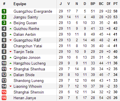 Reste que la 30e et dernière journée de la semaine prochaine ne sera pas dénuée d’intérêt : Beijing et Guizhou, accrochés ce week-end, restent séparée de trois points et se disputeront le dernier ticket pour la Ligue des Champions 2013. En queue de classement, la dernière place dans la charrette se jouera entre Shandong, Liaoning et Shanghai Shenxin.