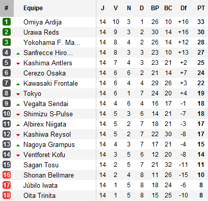 Loin derrière, si Nagoya respire quelque peu en s’imposant face à Shimizu sur un but de Yoshizumi Ogawa dans les derniers instants du match, la situation du Jubilo Iwata, désormais coaché par Takashi Sekizuka, sélectionneur du Japon lors des JO de Londres, ne s’arrange pas. Tenu en échec par le Cerezo, Iwata reste ancré en avant-dernière position au classement à trois points du premier non relégable.