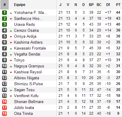 Car devant, Yokohama, Sanfrecce et Urawa continuent d’avance. Les Marinos profitent du dernier week-end pour passer devant grâce à un convaincant succès à Tokyo pendant que le SanFre concédait un nul tardif chez lui face à un Nagoya en pleine bourre (cinq victoires consécutives). Les Marinos mènent désormais la course d’un point.