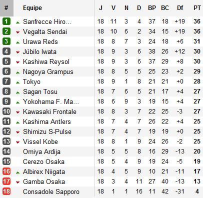 Ailleurs signalons la deuxième victoire consécutive pour les Antlers grâce à un superbe coup-franc signé Mitsuo Ogasawara, le Sagan Tosu confirme sa belle première saison de J-league en s’imposant dans les derniers instants devant Tokyo et Gamba inquiète. Les Ashis s’inclinent chez eux devant les Marinos sur un but signé Manabu Saito à la 94e minute, enchaînant une troisième défaite consécutive. Membre du club des cinq à n’avoir jamais été relégué depuis l’existence de la J-league, Gamba se retrouve désormais à six points de leur ennemi local, le Cerezo, premier non relégable.