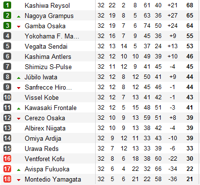 A noter enfin qu'en J2, si le FC Tokyo est désormais sacré champion pour la deuxième fois de son histoire, la montée se jouera entre Sagan Tosu, Tokushima Vortis et Consadole Sapporo, trois équipes qui se tiennent en trois points et qui se disputent l'une des deux places restantes.