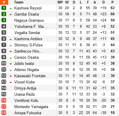 La question était donc de savoir si la trentième journée verrait s’effondrer l’un des membres de ce quatuor. La victime de la journée est donc Yokohama. Longtemps leader, les Marinos poursuivent leur incroyable chute en s’inclinant chez eux devant Urawa et signant leur troisième défaite en quatre rencontres. Relégués à 10 points du leader, tout espoir de titre est désormais perdu. Reste à s’accrocher à la troisième place même si Nagoya est désormais à 7 points.