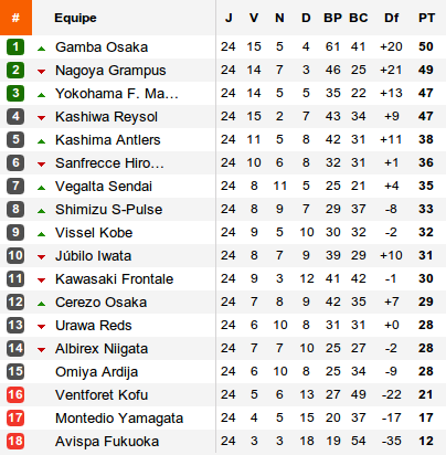 Dans une J-league qui aura vu 6 des 7 premiers s'imposer ce week-end, la mission se complique pour Avispa, dernier avec 12 petits points, Montedio, avant dernier avec 17 points et Kofu, premier relégable avec 21 points, désormais à 7 points du premier sauvé, Omiya.
