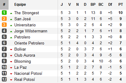 Après cinq rencontres, le champion sortant est déjà aux commandes du tournoi après son succès arraché ce week-end devant La Paz (maintenu après les barrages). Derrière, sa victime de la saison dernière, San José. Seconde attaque du championnat, el Santo enchaîne un troisième succès à domicile (le second 4-0 consécutif) et reste à un petit point du leader, accompagné par Universitario. Derrière eux, les deux promus Petrolero et Wilstermann suivent à une longueur.