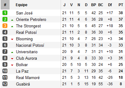 Avec le déplacement de San José sur la pelouse de son poursuivant direct Oriente Petrolero, les avaient l'equipo minero occasion rêvée d’assurer le titre. Mais jamais l’equipo minero n’aura été en position de penser au titre, Oriente Petrolero menant puis finalement s’imposant à domicile. Conséquence, avant la dernière journée qui se déroulera ce week-end, il n’y a plus qu’un tout petit point qui sépare les deux premiers du classement.