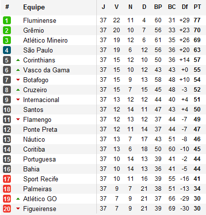 Ce duel à distance constitue de dernier point de suspense pour cette dernière journée du Brasileirão 2012. En haut, Fluminense champion, seule l’identité de son dauphin reste à définir : tout se jouera entre Grêmio et l’Atlético Mineiro. Grêmio conclura à domicile pour un Gre-Nal rendu explosif par la colère des supporters de l’Inter après la défaite à domicile devant Goianiense alors que le Galo, qui a eu la bonne nouvelle d’apprendre la reconduction pour une saison de son Ronaldinho, recevra Cruzeiro.