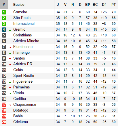 Autre lieu d’une lutte intense : la relégation. Si Criciúma et Bahia ont un pied en seconde division avec six et sept points de retard sur le premier non relégable, la situation de Botafogo, 18e à quatre points, est critique. Le Fogão jouera deux équipes mal classées, dont un concurrent direct Chapecoense, à trois points devant, lors des deux prochaines journées et devra engranger le maximum de points sous peine d’être condamné. Reste que jusqu’à Figueirense, troisième, la survie est loin d’être assurée, Chapecoense n’étant finalement qu’à quatre points.