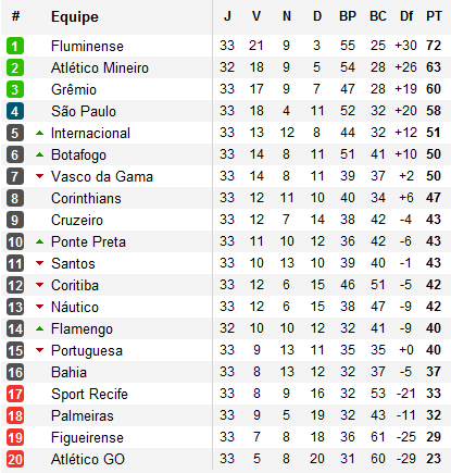 En queue de classement, Sport et Palmeiras tombés, Bahia en profite pour grappiller un point de plus et mettre les actuels deux premiers relégable à quatre et cinq points. Avec un calendrier de folie pour le Verdão (qui jouera Botafogo, Fluminense, Flamengo et Santos au cours des cinq derniers matchs), la situation des hommes de Gilson Kleina semble de plus en plus critique.