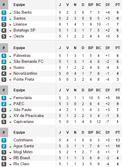 Le championnat se divise en quatre groupes de cinq équipes, où les deux premiers de chaque groupe sont qualifiés pour les quarts de finale. Avec un gros dans chaque groupe, cela devrait éviter les mauvaises surprises, même si São Paulo n'est pour l'instant seulement troisième, avec cependant un match en moins. Après sa défaite surprise en Copa Libertadores, le SPFC s'est repris ce week-end en battant Rio Claro 1-0 au Pacaembu, sur un but de Rodrigo Caio, sévèrement critiqué dans la semaine par le conseiller du président. Dans un match qui marquait le retour de Lugano sous le maillot tricolor, l'ambiance est restée tendue, avec de nouvelles protestations des supporters contre Michel Bastos, pourtant absent lors de ce match, accusé d'être un mercenaire. Le club a en effet des retards de paiement concernant les droits à l'image et l'ancien Lyonnais est monté au créneau.