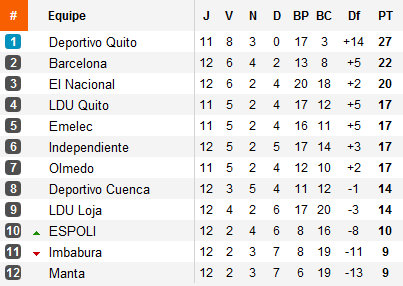 L’écart reste tout de même conséquent : pour décrocher une place en finale, la LDU devra remonter 10 points en 11 journées et surtout miser sur la faillite de deux autre concurrents : Barcelona et El Nacional.
