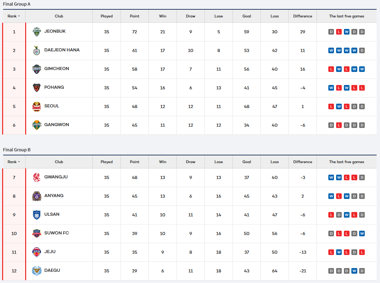 La course à la deuxième place s’intensifie et Daejeon profite des changements majeurs dans l’effectif de Gimcheon pour endosser seul le rôle de dauphin. Face à Seoul, qui affiche toujours les mêmes lacunes match après match, les Citizens ont fait le travail sans trop forcer (3-1), profitant du marquage approximatif de la défense adverse. Une victoire qui mettait la pression aux militaires, qui jouaient plus tard face à Pohang. Sauf que Chung Chung-yong n’a plus ses hommes forts, et cela s’est fait sentir. Dans un match quelconque, ce sont les Steelers qui sortent vainqueurs (0-1) et qui ralentissent leurs adversaires. Au classement, Gimcheon a désormais trois points de retard sur Daejeon et plus que quatre d’avance sur Pohang. Derrière, Seoul reste cinquième et dit certainement adieu au top 4. Pour jouer sur la scène continentale l’année prochaine, les Rouge et Noir devront soutenir Jeonbuk en finale de la Korea Cup, à condition de terminer cinquième. Gangwon, tenu en échec par le champion 2025 (0-0) lorgne aussi sur cette position et n’a plus que trois points de retard.