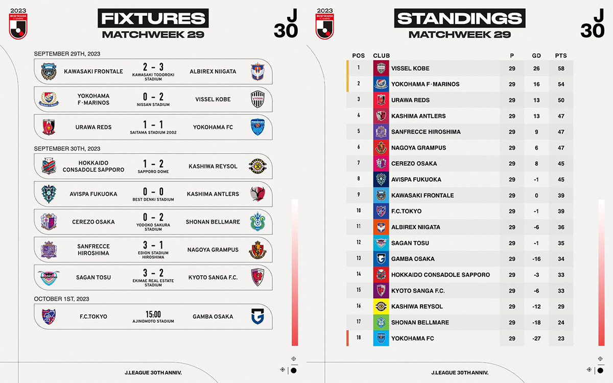 Dans cette dernière ligne droite menant au dénouement de notre championnat favori, la vingt-neuvième journée a été riche en enseignements : Vissel Kobe a toute les clés en main pour enlever le premier championnat de J1 de son histoire, Yokohama F.Marinos est une machine enrayée, Shonan Bellmare n’est pas mort, tandis que Nagoya Grampus n’est plus que l’ombre de lui-même.