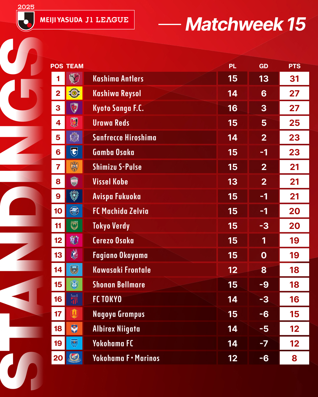 Avant sa victoire contre Kobe, le Cerezo s’est offert un autre derby géographique, contre Kyoto. Deuxième au classement avant ce match, Sanga débute bien la rencontre grâce à des buts de Taichi Hara et Temma Matsuda. Mais Lucas Fernandes, Kengo Furuyama et Motohiko Nakajima ont renversé les hommes de Jo Gwi-jae. Urawa dispose du Tokyo Verdy grâce à deux hommes en forme : Yusuke Matsuo et Ryoma Watanabe. Les Tokyoïtes terminent la rencontre à dix avec l’expulsion de Hiroto Taniguchi. C’est seulement la sixième après quinze journées. Tokyo glane une victoire précieuse face à un concurrent au maintien : l’Albirex Niigata. Marcelo Ryan a ouvert le score, marquant son premier but en J1 en 2025. Kei Koizumi en a rajouté un avant la réduction de l’écart par le jeune Keisuke Kasai. Marcelo Ryan s’est ensuite offert un doublé. Le but en toute fin de rencontre de Danilo Gomes ne change rien, et les tokyoïtes se donnent un peu d’air. Nagoya donne une leçon d’efficacité à Shimizu. Sho Inagaki, Ryuji Izumi et Keiya Shiihashi offrent à Grampus un succès net précieux pour le maintien. Enfin, Hiroshima arrache une victoire précieuse pour se relancer face à Fukuoka. Mutsuki Kato et Ryo Germain, sur un penalty dans les dernières secondes, sont les buteurs. Tomoya Miki avait avant ça égalisé.