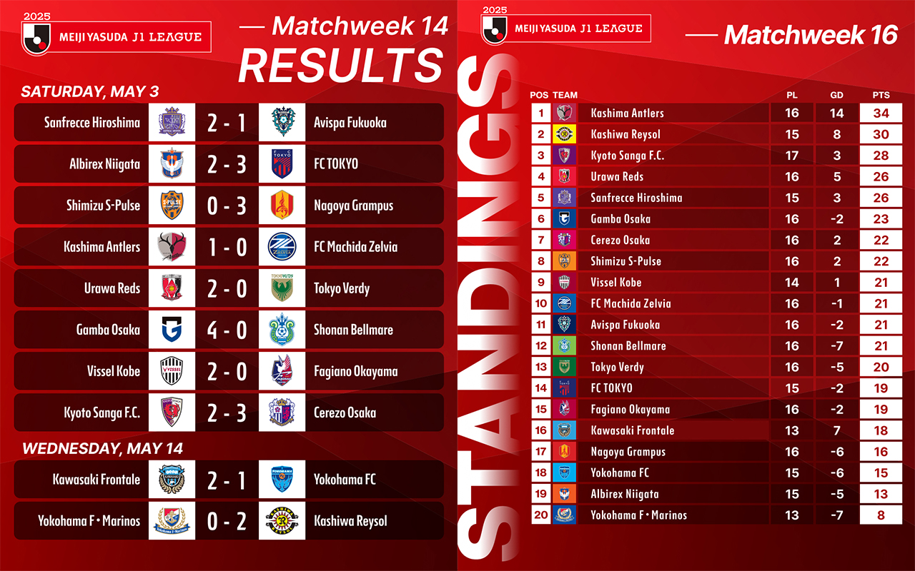 Kashima solide leader, Kashiwa en embuscade et toujours plus de retard pour les Marinos, voici le bilan de la seizième journée de J1 League 2025.