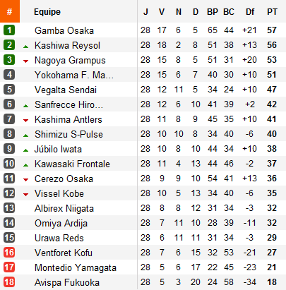 S’il est encore trop tôt pour parler de tournant, la 28e journée de J-league aura permis à Gamba et Kashiwa de prendre leurs distances avec les deux autres membres du quatuor qui jouera le titre. Les Ashi d’Osaka s’imposent dans la douleur chez eux devant Urawa pendant que le promu réalise le coup de la semaine en s’imposant, à dix contre onze, à Kashima. Pendant ce temps, Nagoya tombait à Shimizu et Yokohama, à la surprise générale, explosait à Niigata. Conséquence, Gamba reste leader avec un point d’avance sur Kashiwa, trois sur Nagoya et six sur Yokohama, alors que la 29e journée nous offrira un Nagoya - Gamba quasi décisif pour le titre.