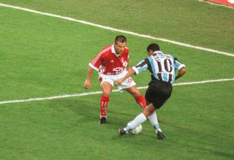 L’Internacional, le rival de toujours de Grêmio, n’est pas non plus au mieux. Malgré le retour de l’idole Dunga, vainqueur du tricampeonato gaúcho entre 1982 et 1984, le club colorado a été humilié 4-0 à domicile en demi-finale de la coupe du Brésil 1999 par un autre club gaúcho, Juventude. L’Internacional, qui compte également dans ses rangs un jeune défenseur, un certain Lúcio, prend sa revanche sur le Juventude deux jours plus tard en demi-finale du championnat gaúcho et se qualifie donc pour la finale, face au Grêmio. Cette année-là, la finale se joue au meilleur des trois matchs. Avec un meilleur bilan, Grêmio a l’avantage de recevoir à l’Olímpico les deux derniers matchs. Lors de la finale aller, le défenseur de l’Internacional, Gonçalves, marque le seul but de la partie. Pour la deuxième rencontre, Ronaldinho, qui a fraîchement soufflé ses dix-neuf bougies, est déjà l’homme du match et ouvre le score sur un magnifique coup franc en pleine lucarne. Agnaldo, d’une jolie frappe enroulée du gauche permet au Grêmio de l’emporter 2-0, une victoire qui initie une série de treize matchs sans défaite contre l’ennemi colorado. Un match nul lors du troisième match est suffisant pour offrir le titre au Grêmio. Mais Ronaldinho en veut plus.