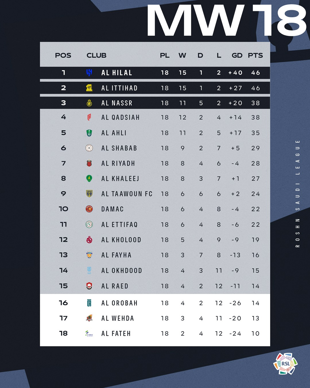 Cette défaite d’Ittihad contre Damac n’a pas profité à Al-Hilal pour autant. Le même jour, les hommes de Jorge Jesus se sont incliné deux buts à un face à un Al-Qadsiah toujours aussi impressionnant. Privés d’Aleksandar Mitrović, les Bleu et Blanc ont pu compter sur la révélation de ce début d’année, Marcos Leonardo. L’attaquant brésilien de vingt-et-un ans est tout simplement le deuxième meilleur buteur mondial de ce début d’année 2025, avec dix réalisations en six matchs toutes compétitions confondues. Il s’est notamment offert un triplé dans la victoire neuf buts à zero contre Al-Fateh. Enfin, pour son dernier match au moins de janvier, Al-Hilal s’est offert une victoire sereine contre Al-Okhdood. Le jeune attaquant de vingt ans Kaio Cesar, arrivée quelques jours plus tôt, a directement débloqué son compteur but. Le Brésilien recruté à Guimaraes au Portugal apportera de la concurrence à un Malcom très irrégulier cette saison. Al-Hilal a récupéré sa première place ce mois-ci, mais reste à égalité de points avec Ittihad. Dans quelques semaines aura lieu un match entre les deux cadors. Le résultat sera sûrement décisif pour la course au titre.