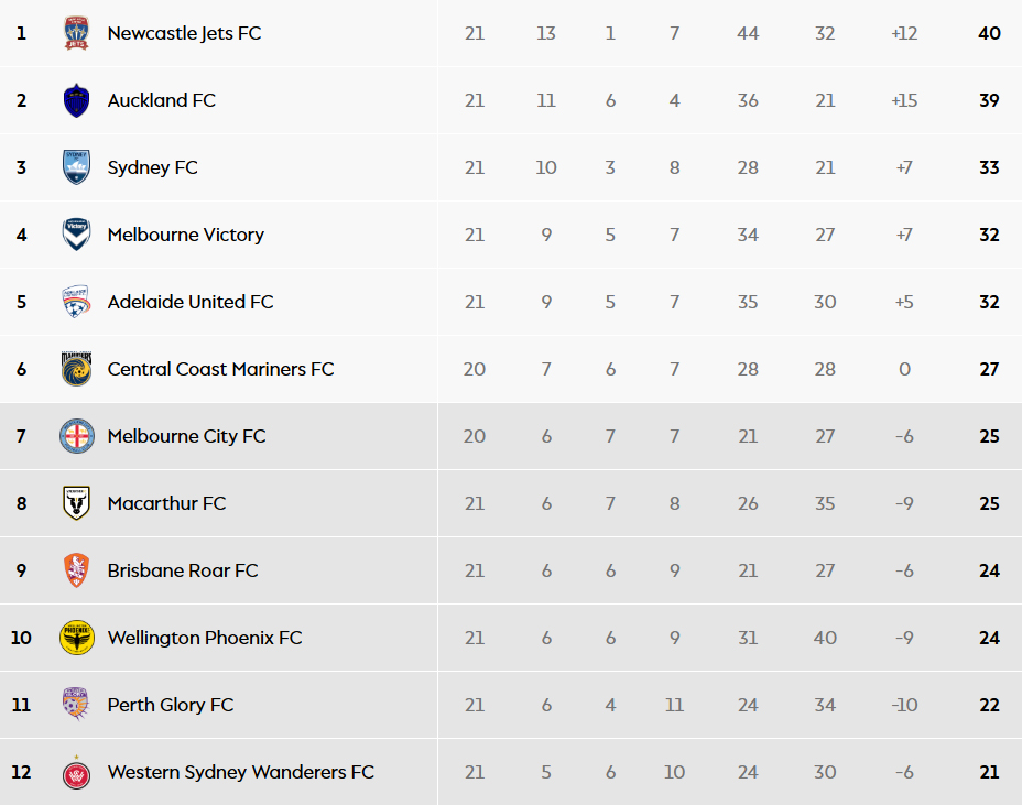 Depuis la mi-février, le rythme s'est intensifié et, en tête du championnat, la hiérarchie n'a pas basculé. Les Newcastle Jets, sous la houlette de Mark Milligan, dominent toujours la ligue avec quarante points au compteur. Une place de leader conservée grâce à de précieux succès arrachés face à Macarthur (1-0) et Western Sydney Wanderers (2-1). Pourtant, la menace néo-zélandaise se fait de plus en plus pressante. Auckland FC a d'abord enchaîné les démonstrations de force, pulvérisant Wellington Phoenix (5-0) puis Melbourne City (3-0). Surtout, les Black Knights ont totalement relancé le suspense le 14 mars en s'imposant directement sur la pelouse du McDonald Jones Stadium face aux Jets (2-1). Une victoire cruciale qui leur permet de revenir à une longueur de la première place.