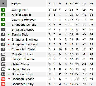 Une victoire 5-0 qui permet aux Evergrande d'accentuer encore leur avance au classement. Car dans le même temps, son poursuivant direct Beijing a été accroché sur le terrain des Hangzhou Lucheng. L'écart est donc désormais de 9 points et on se demande déjà, après seulement 16 journées, si le championnat n'est pas déjà joué.