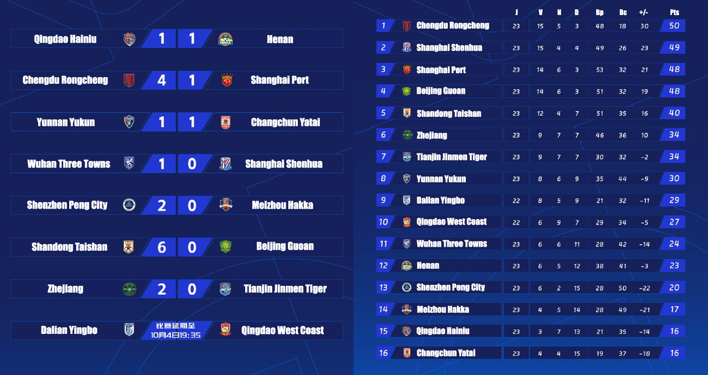 Chengdu Rongcheng s'empare de la tête du championnat après un probant succès face au Shanghai Port FC, tandis que le Shandong Taishan inflige une déculottée au Beijing Guoan. Voici en quelques mots le résumé de la vingt-troisième journée de CSL.
