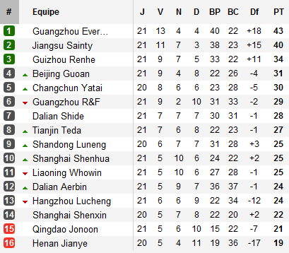 Derrière, Beijing et Kanouté décrochent. Humiliés à Shandong, les Guoan signent une quatrième défaite en cinq rencontres et pointent en quatrième position, à 12 points du leader. Ils sont précédés au classement par le Guizhou Renhe de Zlatan Muslimović, autre grande surprise du championnat. Autre décroché, les Argenlic de Sergio Farias et Yakubu. Deux nuls et deux défaites, la dernière à Dalian, et les R&F sont désormais relégués à cinq points de la dernière place qualificative pour la prochaine Ligue des Champions.