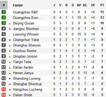 Loin de cette tourmente, les deux clubs de Guangzhou poursuivent leur tranquille domination. Les Argenlic s’imposent chez eux devant la lanterne rouge Dalian pendant que la meilleure attaque du championnat, les Evergrande, brillent face à Hangzhou. Guangzhou R&F reste leader avec cinq victoires en six matchs, talonné par le champion sortant à deux points.