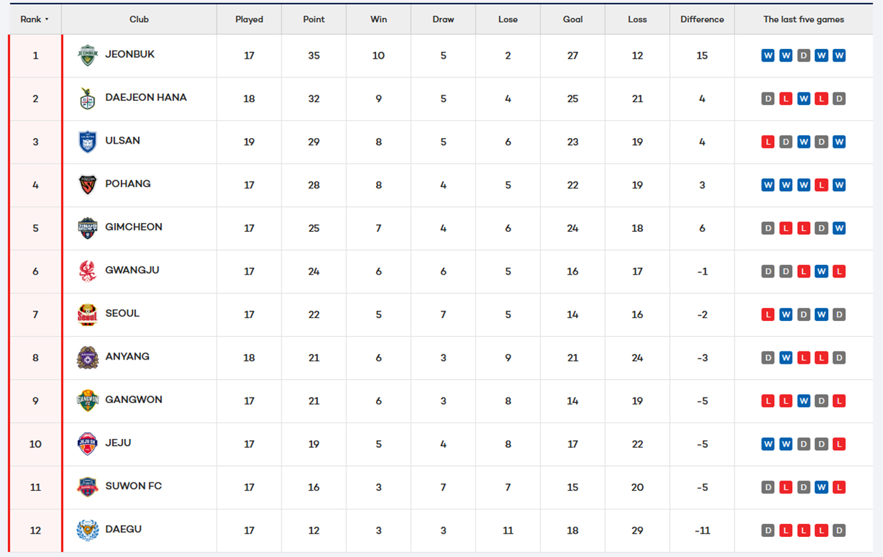 En revanche, les Insulaires se refont une santé puisqu’il s’agissait de leur deuxième victoire cette semaine après celle à Suwon (1-0). De quoi revenir sur les talons d’Anyang et Gangwon au classement. Pour Daegu, l’arrivée de Kim Byung-soo sur le banc pourrait être une bonne solution afin d’éviter la relégation. Pour son premier match sur le banc, les Sky Blues ont arraché un point face à Gwangju (1-1). Mais le chemin est encore long.