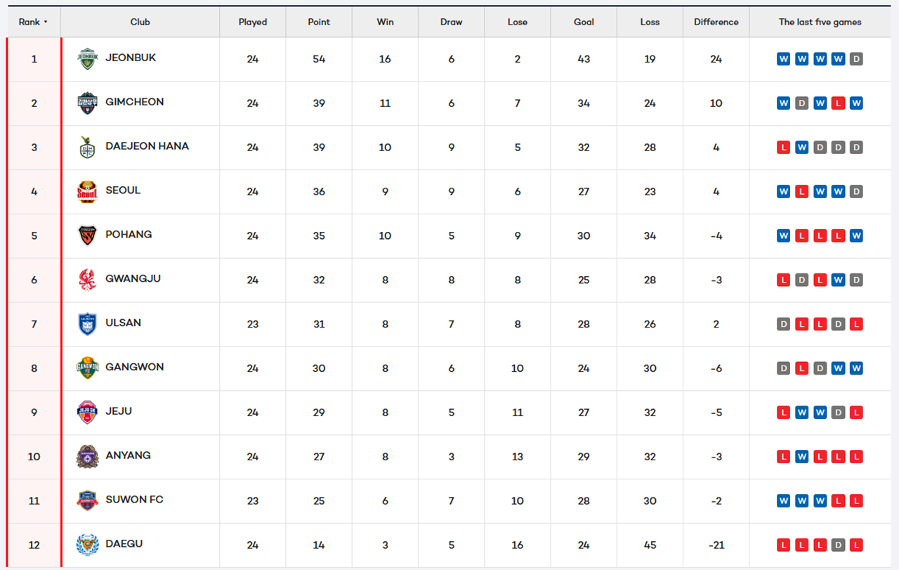 Autre situation inquiétante, celle de Daegu. Les matchs s’enchaînent et les défaites aussi. Terrassés à Anyang (0-4), les Sky Blues ont chuté dans la foulée face aux Steelers et les supporters ont vu rouge. Ils ont refusé de quitter le stade demandant le départ de la direction. Le club est désormais bon dernier avec onze points de retard sur le premier non relégable direct, le Suwon FC. La tâche de Daegu s’annonce impossible d’autant plus que les hommes de Kim Eun-joong marchent sur l’eau. Après leur victoire sur Pohang, ils ont dominé Anyang (2-1) pour se rapprocher de la première équipe en dehors de la zone rouge, Jeju.