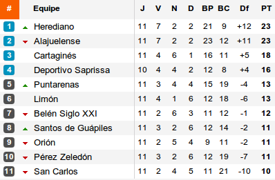 Herediano s'impose tranquillement chez lui devant Puntarenas pendant qu'Alajuelense atomise Pérez Zeledón. La mauvaise opération de la semaine est pour Cartaginés qui ne parvient à faire sauter le verrou mis en place par la lanterne rouge San Carlos. Conséquence, les Azules pointent désormais à cinq longueurs du duo de tête et pourraient voir fondre sur eux le Deportivo Saprissa. Exempt ce week-end, le Monstruo n'est plus qu'à deux points avec un match de retard alors que se profile un choc l'opposant à la LDA le week-end prochain.