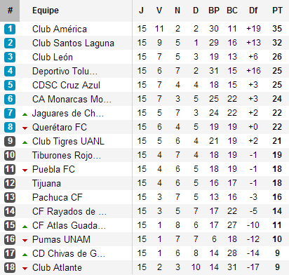 Cette situation fait énormément d’envieux quand on regarde la situation derrière les deux leaders. Car entre León, troisième et Tijuana douzième, ils sont 10 à pouvoir encore rêver à une place en Liguilla. León dispose cependant d’un matelas de 5 points sur le premier non qualifié qui devrait lui permettre de se qualifier sans trop trembler. Même chose pour Toluca et Cruz Azul, qui comptent quatre points d’avance et pourraient valider leur billet ce week-end à domicile en cas de victoire. Au rayon des bonnes affaires, la victoire des Tigres en match en retard face au leader América, permet aux hommes de Ricardo Ferretti de revenir à un point de Querétaro et des Jaguares qui joueront les deux leaders ce week-end.