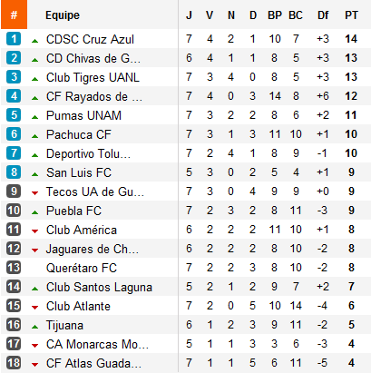 Dernier invaincu de la ligue, les Tigres s’imposent à Atlas et se placent à un point de Cruz Azul, soit à la même hauteur que Chivas (ces derniers comptant encore un match de retard). Reste que les positions sont extrêmement resserrées, 5 points séparant Cruz Azul de Puebla. En bas de classement, malgré le cinquième but en autant de matchs de Dayro Moreno, Tijuana ne décolle toujours pas.