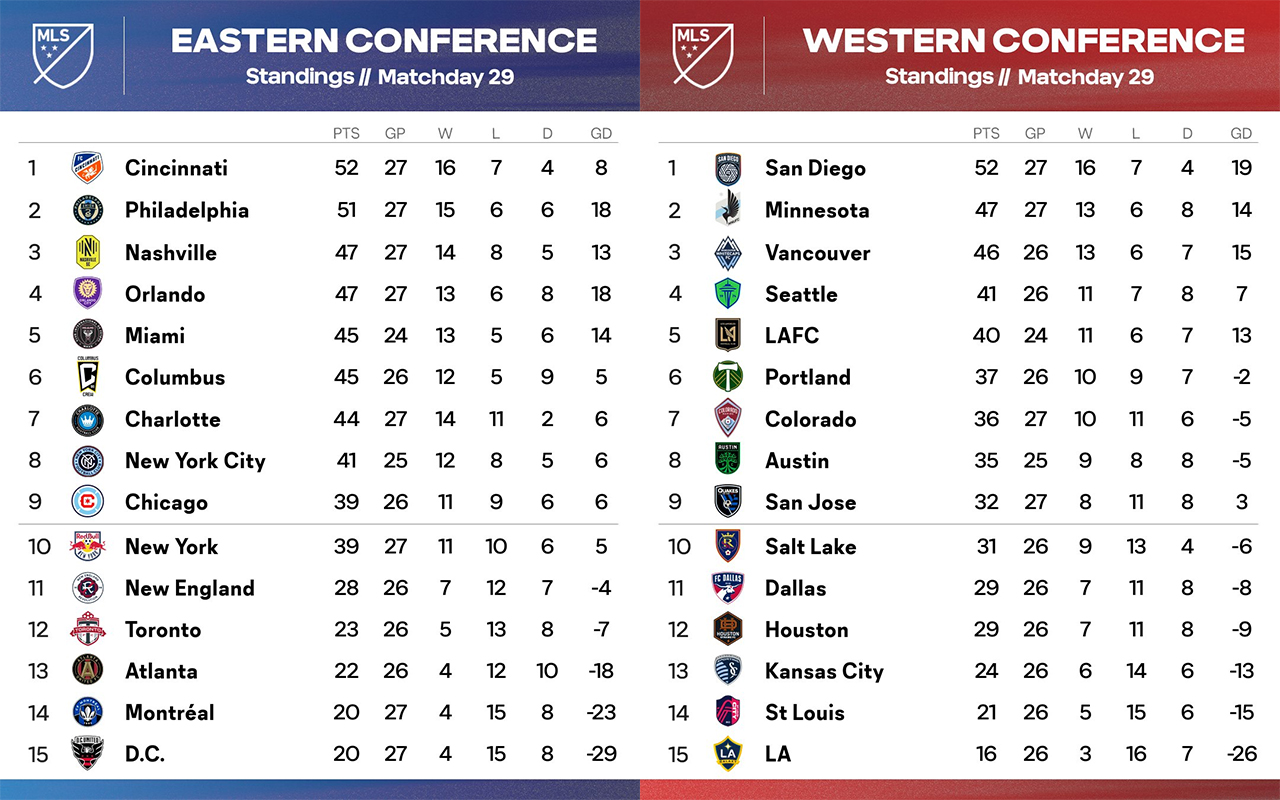 La semaine 29 a ainsi confirmé cette tendance : San Diego s’est donc emparé de la première place dans la course au Supporter’s Shield après sa victoire sur San Jose (2-1). Car dans le même temps, Cincinnati, vainqueur de Portalnd (3-2) n’a su en profiter pour garder son fauteur alors que Philadelphie, qui avait encore une fois l’occasion de conserver sa première place, s’est pris les pieds dans le tapis face au New York Red Bulls (0-1). L’Union redescend au troisième rang, à un point du duo. Attention toutefois, ce classement est provisoire puisque l’Inter Miami a de nouveau les moyens de prendre la tête une fois ses trois matchs en retard disputés. Avec le retour de Leo Messi, les Hérons ont repris des couleurs et écrasé la lanterne rouge, le LA Galaxy (3-1). Derrière, Nashville enchaîne un troisième revers de rang face à New York City (2-1), voyant Orlando et Minnesota lui revenir dessus après leur succès sur Kansas City (3-1) et Seattle (1-0).