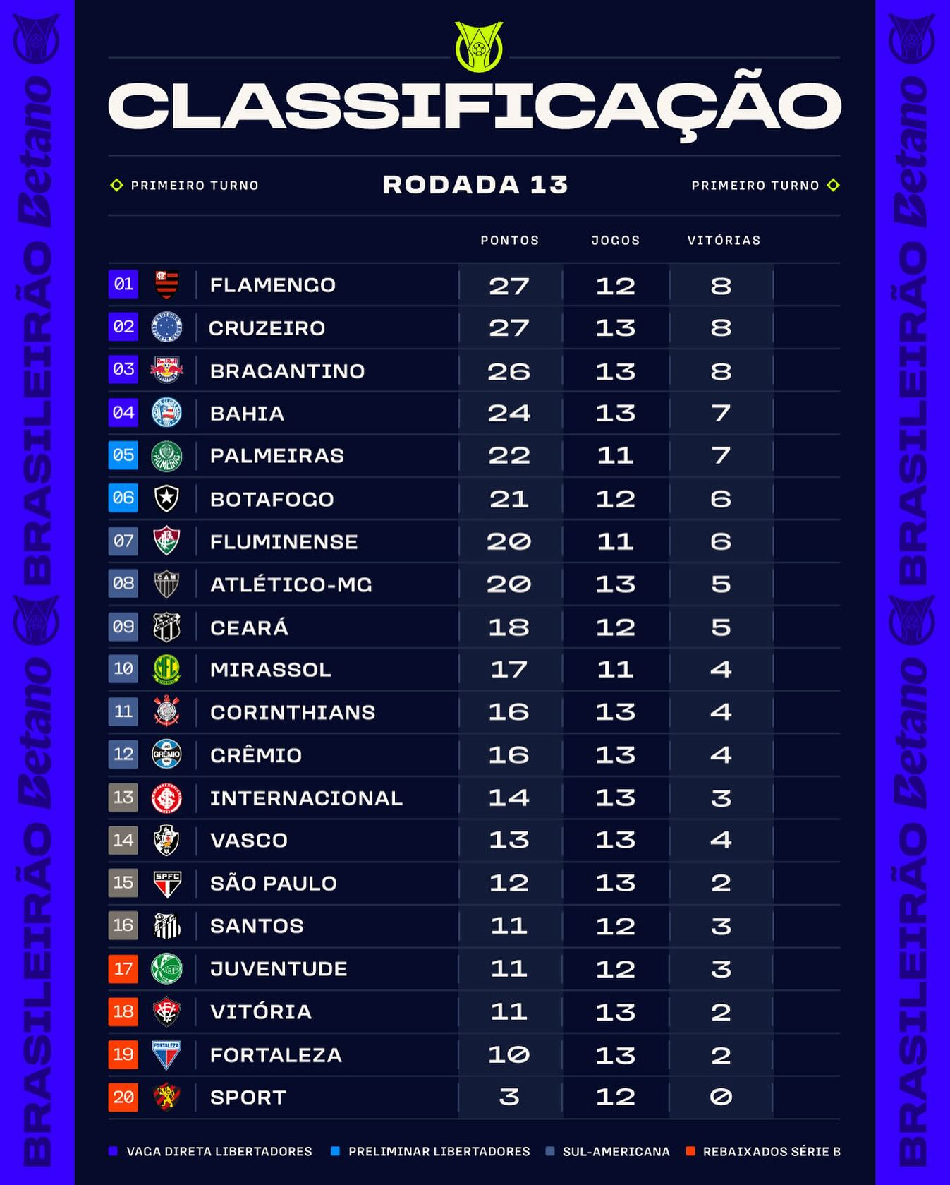 Après un mois de pause en raison du Mondial des clubs, le Brasileirão a repris ses droits ce week-end, le leader Flamengo ouvrant la treizième journée, au Maracanã face à São Paulo. Éliminé en huitièmes de finale du Mondial par le Bayern, Flamengo retrouve le chemin de la victoire, Luiz Araújo faisant valoir la lei do ex avec un golaço face à son ancien club. Brillant lors du tournoi aux États-Unis, Wallace Yan ajoute un nouveau but en sortie de banc et permet à Flamengo de rester en tête du championnat. Le club rubro-negro est suivi de près par Cruzeiro, qui a écrasé Grêmio (4-1) avec notamment un triplé de Kaio Jorge, qui prend la tête du classement des buteurs, pointant désormais à onze buts en douze matchs.