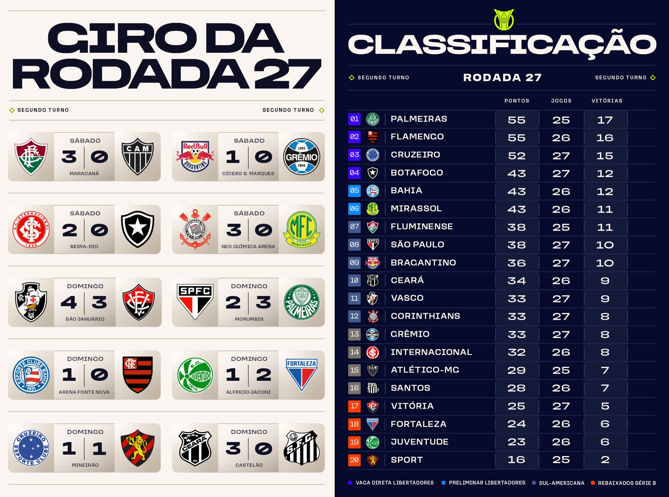 En ouverture de la vingt-septième journée, Fluminense bat facilement l’Atlético Mineiro au Maracanã et remonte à la septième place. Dans le même temps, le Red Bull Bragantino compte sur un penalty polémique transformé par John John pour battre Grêmio dans le temps additionnel. Autre victoire à domicile, celle de l’Internacional face à Botafogo sous un déluge pour le premier succès du nouvel entraîneur Ramón Díaz. L’Internacional s’offre un peu d’air au classement alors que Botafogo reste dans le G-4 malgré la défaite.