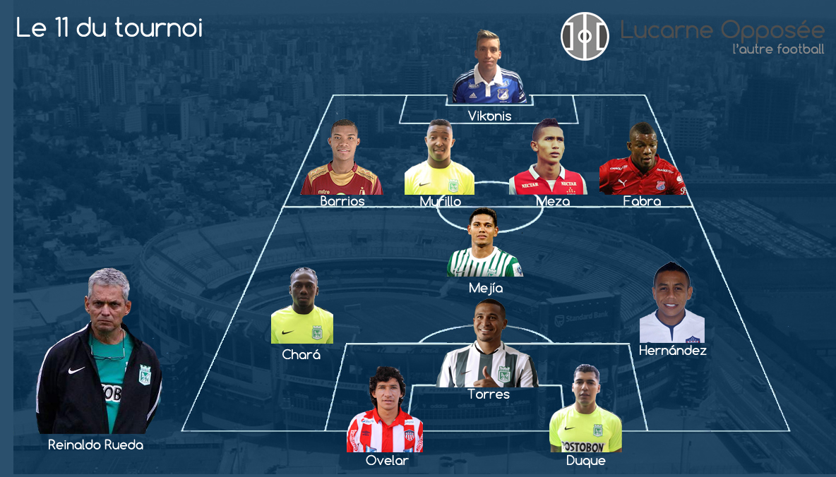 Pour notre sélection, on avait l’embarras du choix dans les buts. Ainsi, à l’excellent Armani, décisif en finale, on préfèrera Nicolás Vikonis, auteur d’un tournoi quasi-sans faute avec Millonarios avec qui il a été l’un des meilleurs éléments. Devant lui, on fera un choix offensif sur les côtés en plaçant Franck Fabra d’un côté et Wilmar Barrios, qui peut aussi évoluer au milieu alors qu’un Helibelton Palacios mérite aussi quelques éloges. Dans l’axe, deux tours de contrôle : Óscar Murillo, chef de la solide défense verdolagas (11 buts encaissés sur les 26 matchs du tournoi (cuadrangulares compris), 17 clean sheets), Francisco Meza, élégants et précieux axial de Santa Fe. Les deux joueurs sont aujourd’hui au Mexique. Devant eux, un losange avec l’inépuisable Alexander Mejía à la récupération, le toujours génial Macnelly Torres à la création et les machines à perforer Chará – Hernández sur les côtés. Devant, deux machines à but : Jefferson Duque retrouvé et Roberto Ovelar. Pour encadrer le tout, il ne pouvait y en avoir qu’un, Reinaldo Rueda qui a remis l’Atlético Nacional sur le devant de la scène, gérant à merveille la transition post-Osorio.