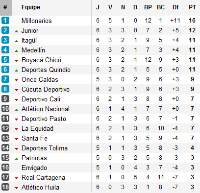Car derrière, Junior et Itagüí se neutralisent lors de l’affiche de la sixième journée (1-1) et cèdent donc deux points. Junior est désormais à quatre longueurs, Itagüí à cinq. Les Águilas Doradas sont rejoints par trois équipes : Medellín, qui l’emporte à Bogotá face à La Equidad et se relance après deux nuls, Boyacá Chicó sauve trois précieux points à Cali face à un Deportivo à deux doigts de sauver le nul malgré l’expulsion de Faryd Mondragón et le Deportes Quindio qui s’impose dans les derniers instants à Neiva face à l’Atlético Huila. Ces deux équipes s’offrent une semaine à six points.