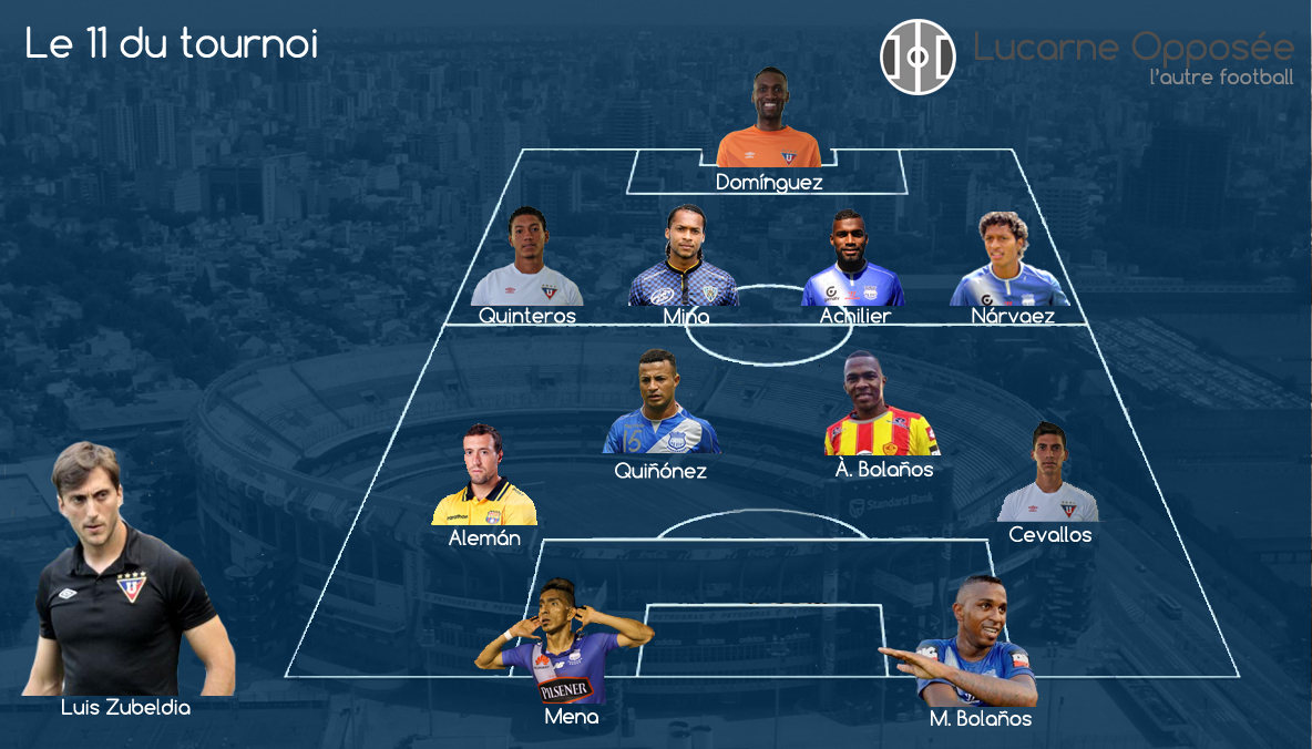 Ainsi, nous choisiront un 4-2-2-2 assez classique au pays avec le portier international Alexander Domínguez dans les cages, une défense composée (de droite à gauche) de John Nárvaez, Arturo Mina (premier « intrus » car joueur d’Independiente), Gabriel Achilier, José Quinteros, un duo défensif Pedro Quiñónez – Àlex Bolaños (deuxième « intrus » venant d’Aucas), deux milieux offensifs / créateurs José Cevallos Jr et Brahian Alemán (le dernier intrus issu de Barcelona) et l’inévitable duo Miller Bolaños - Ángel Mena pour animer l’attaque. Pour diriger le tout, on saluera le travail de Luis Zubeldia avec la LDU qui sera désormais bien orpheline de son jeune technicien argentin parti désormais rechercher la gloire au Mexique, même si on aurait pu citer l’entraîneur champion Omar de Felippe qui a parfaitement succédé à Gustavo Quinteros ou bien Pablo Repetto dont le formidable travail avec les gamins d’Independiente reste une référence au pays et Jorge Célico qui a métamorphosé la Católica.