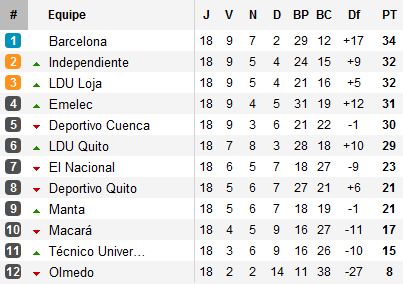 Car dans le même temps, Independiente s’imposait à Macará et surtout, Barcelona remportait le Clásico del Astillero face à Emelec, choc incontestable de la 17e journée. Avec ce succès acquis à l’Estadio George Capwell, les Canarios en profitent pour prendre la tête, comptant désormais deux points d’avance sur Independiente et Loja, trois sur leur plus féroce rival Emelec.