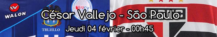 L'équipe péruvienne de César Vallejo devra batailler ferme pour résister aux assauts brésiliens. La saison passée, les péruviens ont encaissé beaucoup de buts, on verra donc s’il y a eu une remise en question, espérons pour eux sinon ça risque de faire mal ce soir. Car en face, le São Paulo de Bauza rentre en piste et on attend bien évidemment une bonne performance de son équipe lors de ce premier tour. Verra-t-on Calleri débuter sous ses nouvelles couleurs? Est ce qu'on va assister à un jeu porté sur l'attaque (même si ça ne ressemble pas trop à la philosophie du bonhomme) histoire de tuer tout suspense dès le match aller? Réponse dans la nuit.