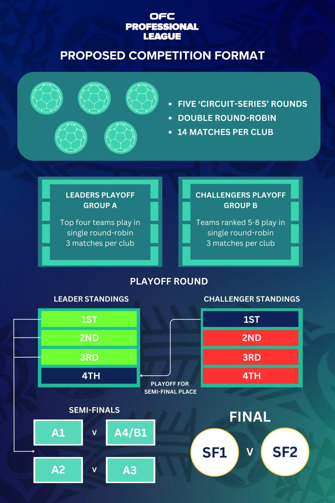 Cette nouvelle épreuve aura également droit à un format très particulier et se tiendra entre janvier et mai 2026. Les huit clubs se feront face en saison régulière tout autour du Pacifique au cours de quatorze journées. À l’issue de celle-ci, les quatre premiers se qualifient pour le Leaders Playoffs Group, les quatre suivant pour le Challengers Playoffs Group. Trois nouveaux matchs sont disputés, les trois leaders du premier groupe se qualifient pour les demi-finales, le quatrième du Leaders Playoffs Group affrontera le vainqueur du Challengers Playoffs Group pour le dernier ticket. Demi-finales et finale se disputeront sur une seule rencontre. « Le format garantit que la compétition reste passionnante jusqu'à la fin, l'équipe classée quatrième ayant la possibilité d'affronter l'équipe classée cinquième pour une place en demi-finales. Cette structure permet de donner un sens à chaque match et de maintenir l'intensité de la compétition tout au long de la saison » a expliqué M. Stuart depuis le siège de l’OFC en février. Prochaine étape, l’élection des huit heureux élus.