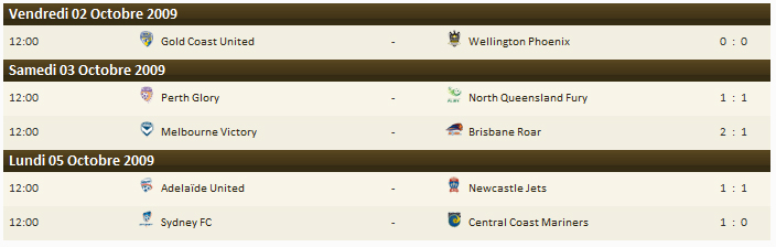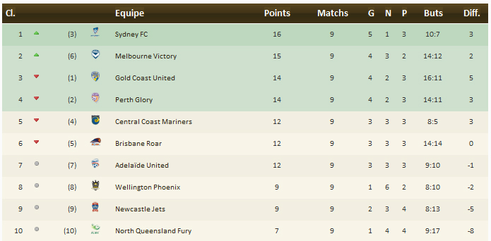 Ce qu’il faut retenir : On avait laissé la A-league aux mains de Gold Coast, on le retrouve cette semaine plus ouverte que jamais. Premièrement, Gold Coast ne gagne plus. Depuis la victoire obtenue face à Sydney début septembre, Gold Coast matchs nuls et défaites. Dernière en date, celle concédée devant Melbourne suivi ce week-end d’un match nul à domicile contre Wellington. A l’opposé, Melbourne réalise le retour au premier plan le plus impressionnant. 3 victoires consécutives et revoilà les Victory à la seconde place. Devant, c’est le FC Sydney qui maintien le rythme. Après une saison dernière décevante, Sydney semble parti en reconquête, la victoire acquise ce week-end devant Central Coast lors du choc au sommet de la 9e journée, témoignant ce retour. Une certitude cependant, la A-league 2009-2010 s’annonce extrêmement ouverte. En témoigne les 4 points séparant Sydney, leader, d’Adélaïde, 7e. Alors que l’Australie se prépare au choc au somment qui opposera Melbourne à Sydney ce vendredi, les positions devraient bouger rapidement.Le classement (cliquez sur l'image pour agrandir) :