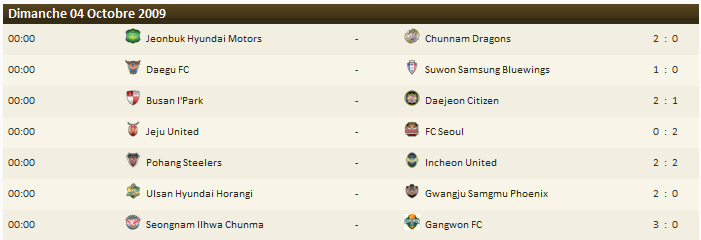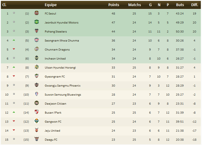 Ce qu'il faut retenir : Alors qu’il ne reste que 3 matchs à disputer pour la plupart des équipes, 3 d’entres elles ont acquis leur billet pour les play-offs : le FC Séoul, Jeonbuk et les demi-finalistes de la Ligue des Champions : les Pohang Steelers. Ces derniers ont d’ailleurs confirmé leur excellente forme actuelle en s’imposant hier devant le FC Séoul en match en retard. Derrière, la lutte fait rage. Si la tache parait quasi-impossible pour Suwon, 10e à 6 point du dernier strapontin, ils sont 6 en 6 points. Les affrontements directs ont ainsi un poids non négligeable, comme la victoire de ce week-end des Ulsan Hyundai Horangi face aux Gwangju Samgmu Phoenix, offrant à Ulsan la possibilité d’espérer encore. Pas encore mathématiquement hors course de cette lutte, Daejeon Citizen pourrait, en cas de succès lors de ses deux matchs en retard, venir semer la pagaille.Le classement (cliquez sur l'image pour agrandir) :
