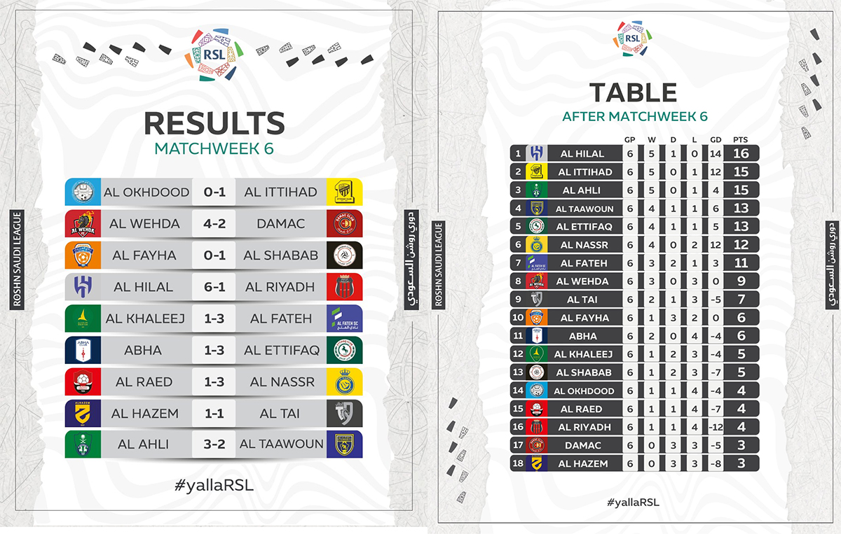 Les autres matchs de la journée n’ont pas non plus offert de surprises. Mané, Talisca et Cristiano ont permis à Al-Nassr de battre un Al-Raed très tenace 3 buts à 1. L’Ettifaq de Steven Gerrard s’impose sur le même score contre Abha, grâce à Robin Quaison, Hamed Al-Ghamdi et Moussa Dembélé. À noter qu’un autre ancien lyonnais a marqué, mais pour Abha : Karl Toko Ekambi. En déplacement chez le promu Al-Akhdoud, Al-Ittihad a eu beaucoup de difficultés face à une équipe compacte et quand même plutôt joueuse, mais a finalement gagné sur le plus petit des écarts grâce à Benzema. Al-Wehda, le club de La Mecque, a battu le modeste Damac 4 buts à 2 grâce à un triplé d’Odion Ighalo, qui fait beaucoup de bien depuis son arrivée, et à un but de Craig Goodwin. Enfin, Al-Fateh, club de Lucas Zelarayán, a battu Al-Khaleej 3 buts à 1. Le Marocain Mourad Batna s’offre un nouveau doublé et le troisième but est signé Sofiane Bendebka. Si certains scénarios de matchs ont été assez étonnants, les résultats, eux, ne l’ont pas été et la hiérarchie commence sérieusement à s’ancrer dans cette Saudi League.