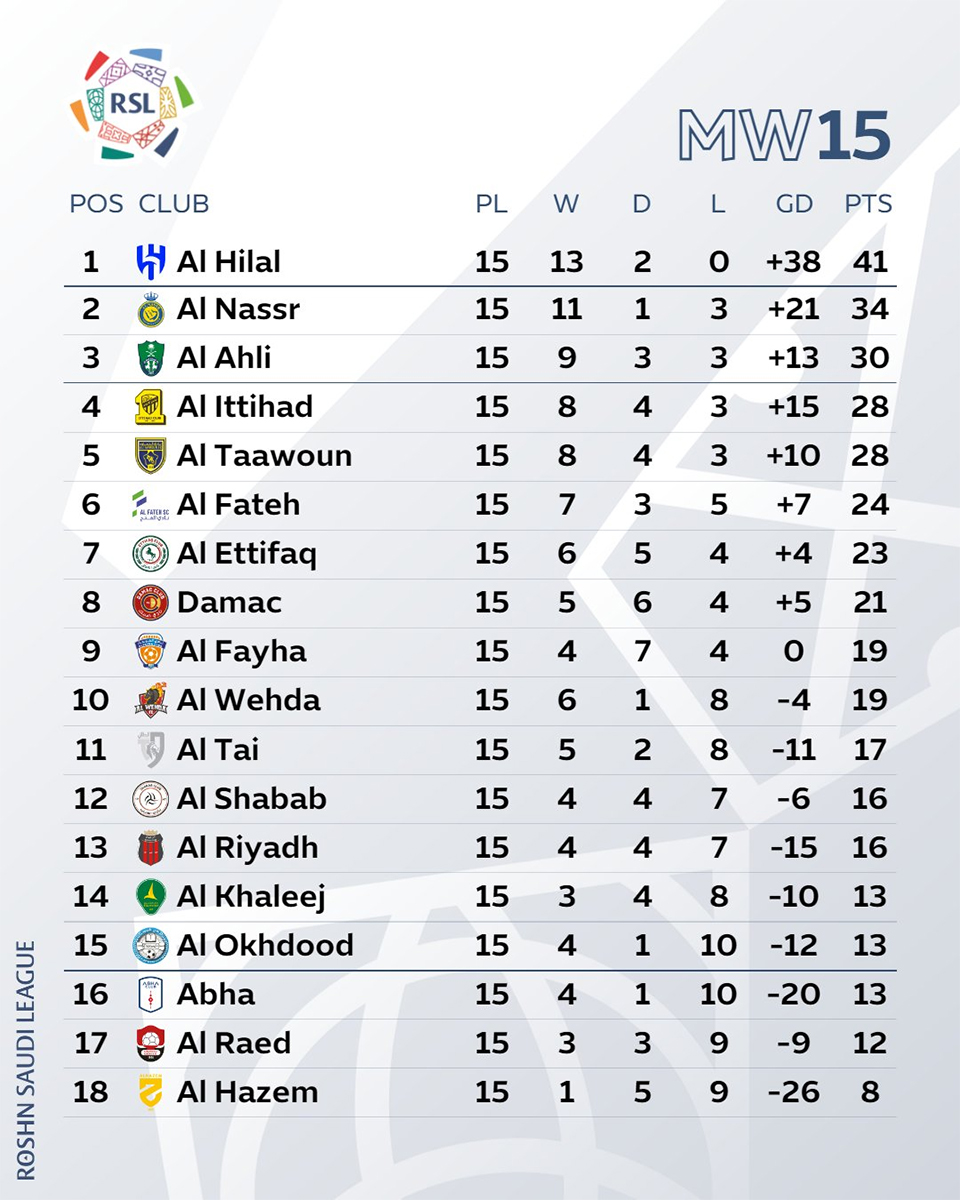 Alors que la seizième journée de Saudi Pro League débute aujourd’hui, un bilan du début de saison peut être tiré. Décadence des clubs de Jeddah, crise à Al-Shabab et saison exceptionnelle pour Al- Hilal. Voici le résumé des quinze premières journées du championnat saoudien.