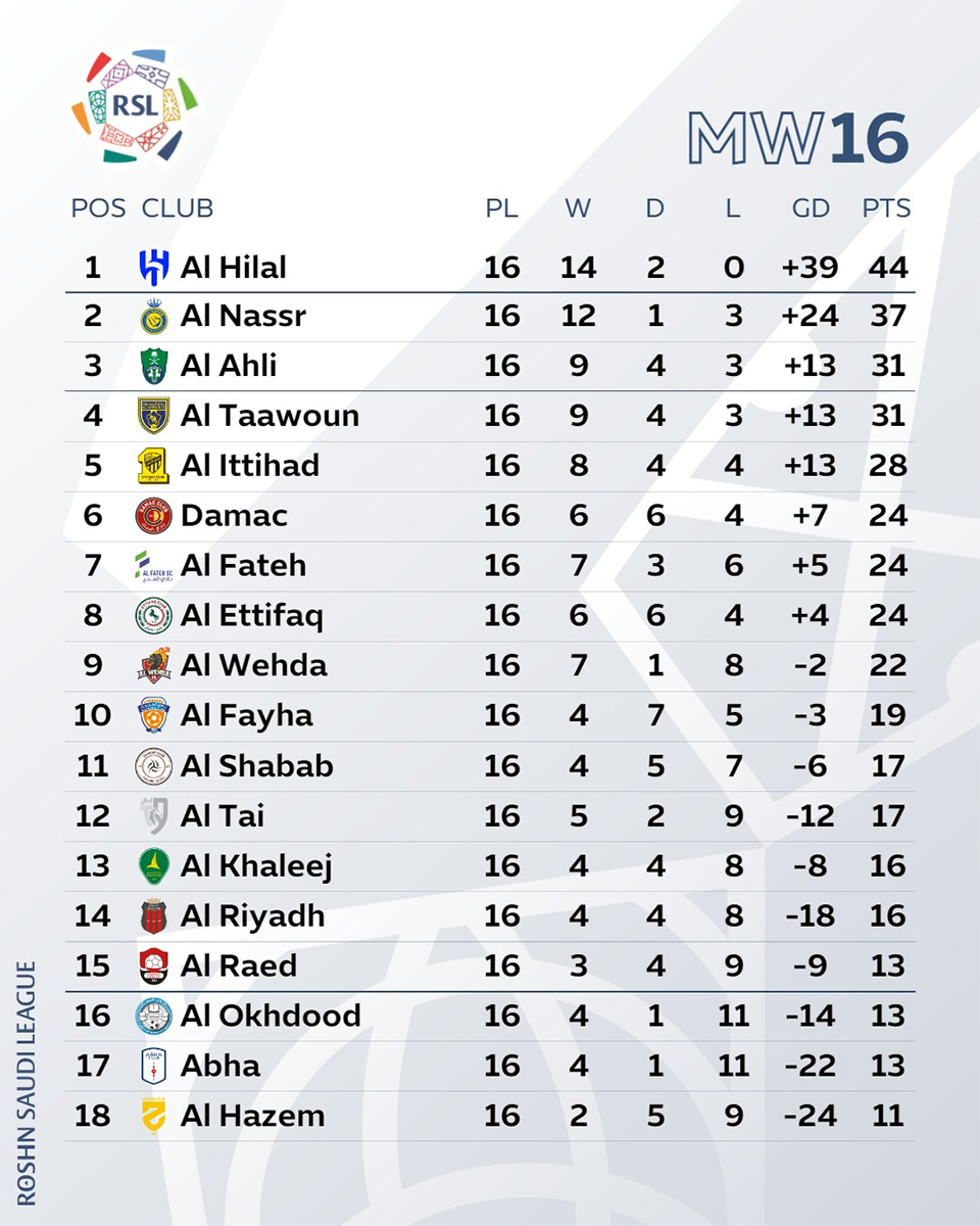 Al-Nassr et Al-Hilal reprennent leur bataille à distance, les clubs de Jeddah sombrent un peu plus, et Al-Taawoun régale… Voici le bilan de la 16e journée de Saudi Pro League 2023-2024.
