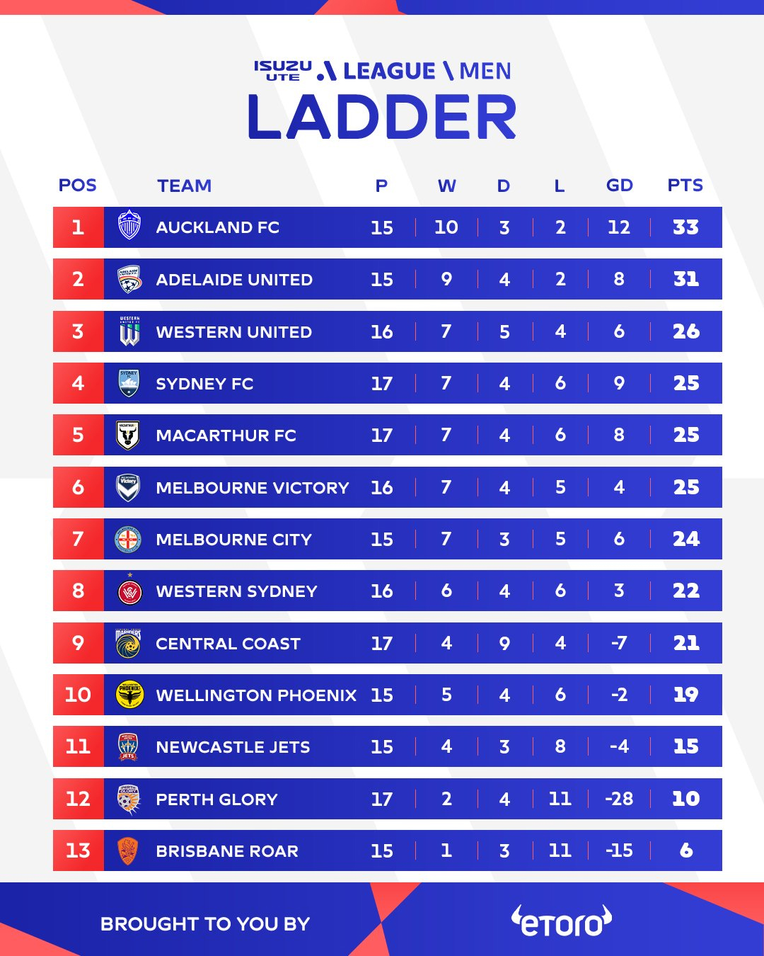 Pendant ce temps, Newcastle Jets a enfin offert à ses supporters une victoire à domicile. Face à Melbourne Victory, les Jets ont déroulé en fin de match pour s’imposer 3-0, après un penalty de Kosta Grozos (donné après une interruption de quinze minutes pour une urgence médicale en tribunes), puis des buts de Clayton Taylor et Lachie Rose. « J’ai pris un gros risque en changeant de gardien, mais Noah James a répondu présent », savourait Rob Stanton, qui a relégué Ryan Scott sur le banc. Un choix payant. En haut du classement, Adelaide United continue d'impressionner. Grâce à un huitième but cette saison d’Archie Goodwin, les Reds ont battu Melbourne City (1-0) et reviennent à seulement deux points d’Auckland FC, leader toujours accroché à la tête du classement et qui n’a pas joué ce week-end. « Archie a beaucoup progressé, il prend confiance et il est sur la bonne voie », s’enthousiasme son coach Carl Veart. Une dynamique qui pourrait bien propulser le buteur dans les petits papiers de Tony Popović et des Socceroos. Western United, lui, a manqué l’occasion de conforter sa troisième place en concédant un nul (2-2) contre Macarthur. « On devait plier le match en seconde période, on a eu cinq énormes occasions », regrettait John Aloisi, un brin amer. Son équipe reste toutefois solidement ancrée sur le podium.
