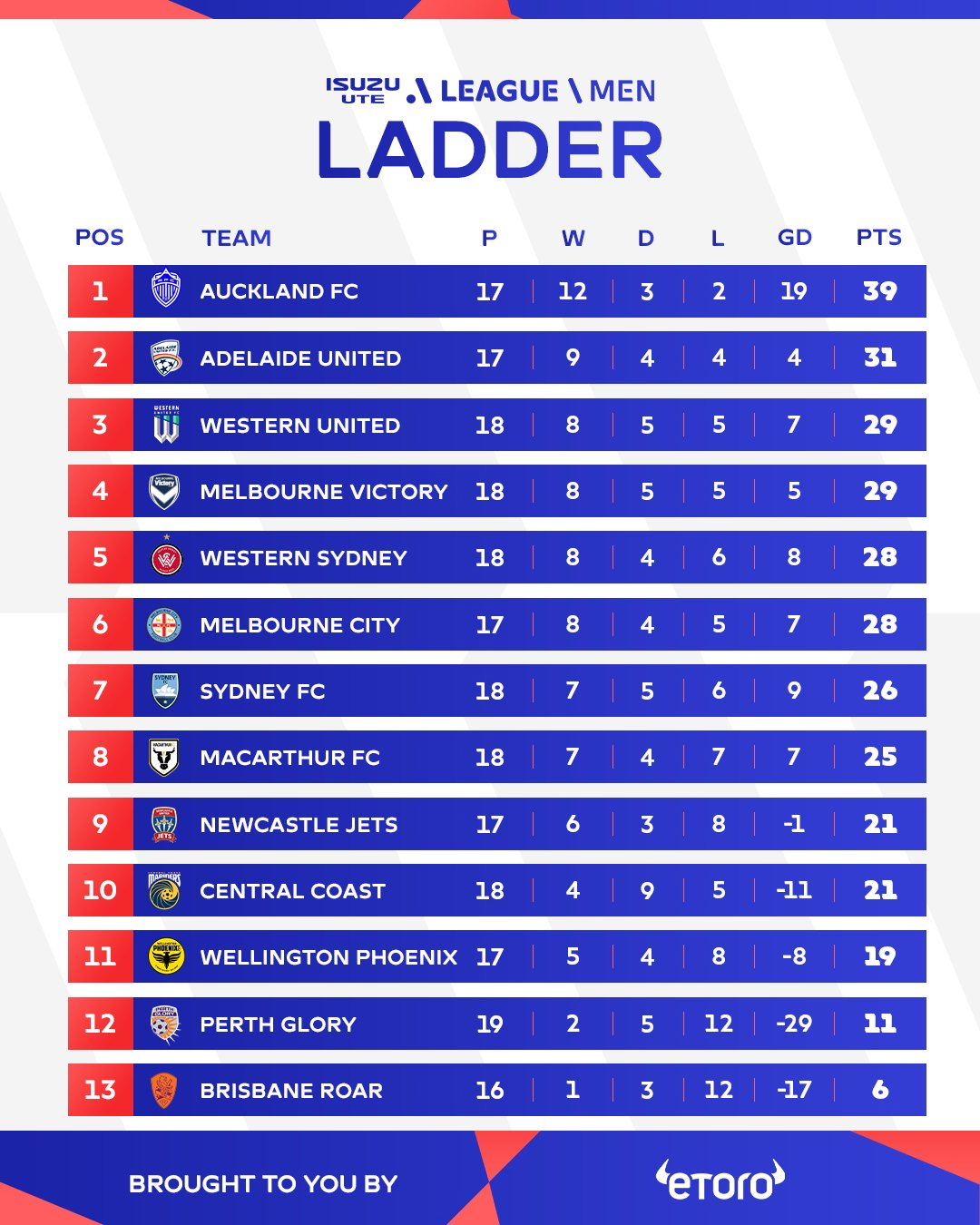 Adelaide United, deuxième avant cette journée, a subi une véritable claque sur le terrain de Western United (0-3). Noah Botic, auteur de son neuvième but de la saison, frappe à la porte des Socceroos, mais John Aloisi préfère temporiser : « Il a encore une marge de progression. Si ça n’arrive pas maintenant, ça viendra ». De quoi maintenir la motivation de l’attaquant dans la course au Soulier d’Or. Enfin, Central Coast Mariners a sombré face à Western Sydney Wanderers (0-4). Mark Jackson n’a pas caché son agacement après cette débâcle : « Ce n’est pas une représentation fidèle de notre équipe ». Quant au Sydney FC, incapable de faire sauter le verrou de Perth Glory (0-0), il reste à la lutte pour accrocher le top six.