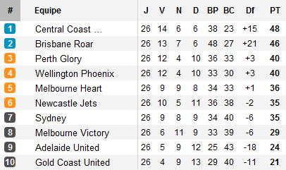Une certitude cependant, Central Coast et Brisbane sont assurés de disputer la demi-finale. Car derrière, Wellington est lourdement tombé à Melbourne alors que Perth en a fait de même à Gold Coast. Les deux équipes, assurées de disputer le tour de play-off à domicile, lutteront à distance pour la troisième place.